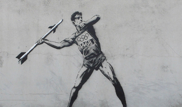 Et alors que la cérémonie d’ouverture aura lieu dans deux petits jours, l’anglais Banksy, artiste urbain de son état, nous dévoile deux nouveaux pochoirs qui mettent les JO 2012 à l’honneur.